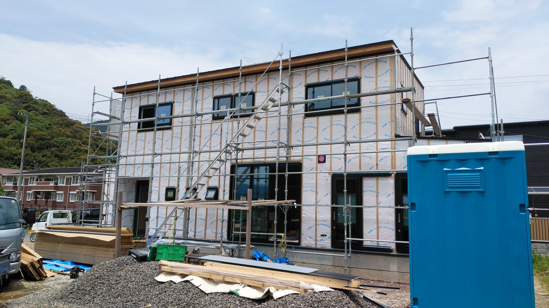 本体を張ったあとはサッシ回りや外角、内角や軒天回り横張りのジョイントなどに最後に役物付けます。