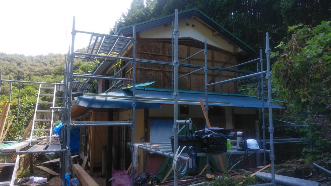 昼すぎには2階の屋根の棟以外の部分の施工は終わり、棟には仮の養生をして一階部分の作業に移りましたが、間もなくすると天気が急激に悪くなり大雨になりました。その間作業を中断し休憩しながら雨が上がるのをまち、3時半頃からスタートしました。まだもう少しやれる部分がのこりましたがこの天気でこれだけはかどればまずまずかな。