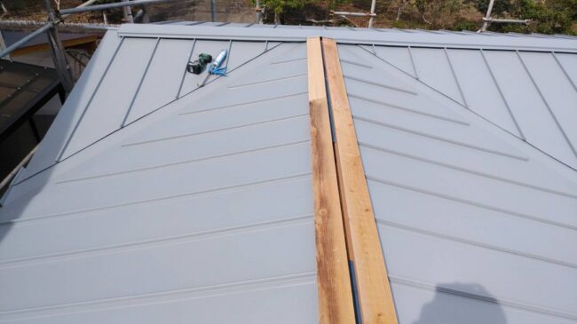 いつも棟に下地の木材を取り付ける場合は、真ん中をピッタリくっつけますが今回は棟の数か所に既製品の換気棟をのせるため、あえて空気の通り抜ける隙間を空けて施工しています。 既製品の換気棟は、コの字型の建物の全体に6ケ所、配置…