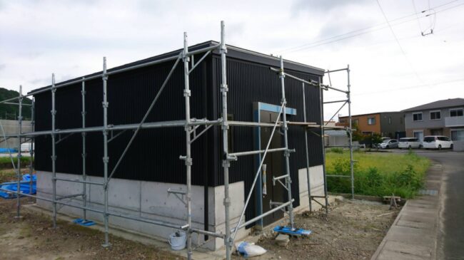 6月頃から着工していましたが。一部まだ決まっていない部分もあり、その間作業をストップしていましたが、それも決まり仕上げの作業さいかいです。 タテヒラぶきの屋根はシルバーでKスパンの外壁が黒ですがギンギラギン…