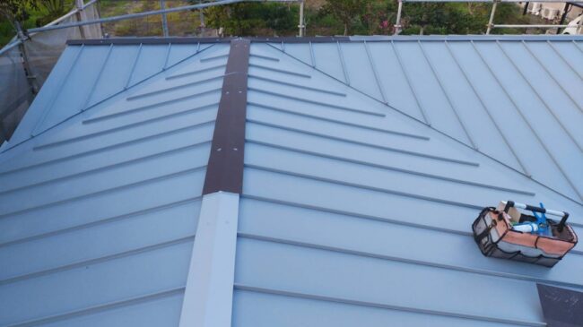 カンゴウ式タテヒラぶき屋根は通常のタテヒラぶきがジョイント部分を専用の機械二種類を使って、つかんで折りたたむ2回の作業工程がかかるのに対して、ジョイント部分を強い力で押し込むだけで簡単には外れにくくなり、それだけで仕上げ…