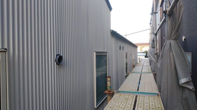 隣の建物と隣接する裏側の比較的目立たない外壁面は小波で施工しました。 横の長さがけっこうある家ですが小波は働き幅が広いので一枚貼るごとに進むのが速く感じます。しかし当たり前ですが全部なみなみなので丁度いいホルソーのサイズ…