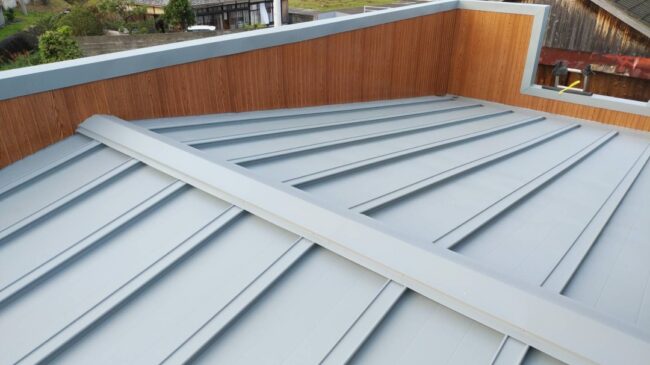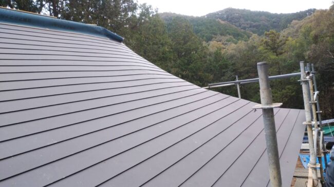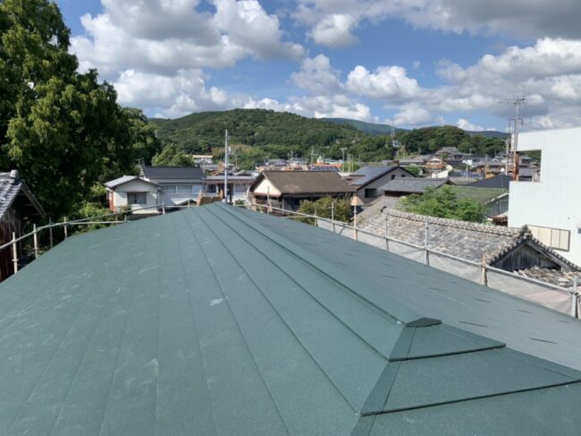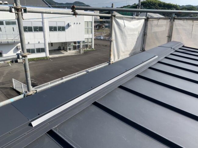 片方にだけ屋根がかたむいている四角形の屋根の一番高いところにきせい品のかんきムネを二つとりつけました。 屋根の種類はカンゴウ式のタテヒラです。カンゴウ式とは?屋根のかたむきにあわせてタテ方向に取り付けていくタテヒラぶき…