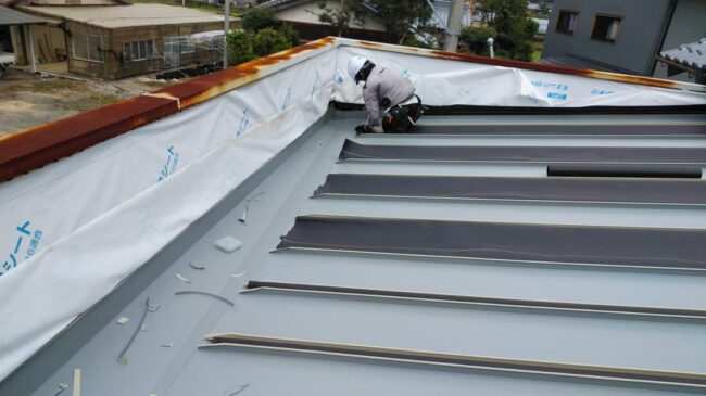 四万十市で新築平屋だての切りづま屋根にガルバリウム鋼鈑製ヨコブキをせこうしました。 まずはじめに下地の断熱材の全面にしかれたアスファルトルーフィングを、屋根からでている箇所だけ下地の木材のきわでカットしていきます…