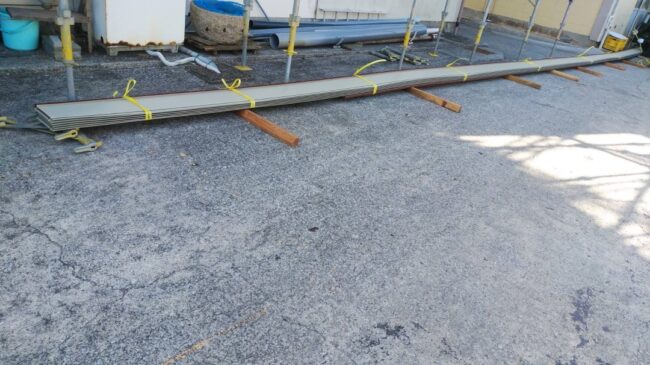 長いところで15メートルぐらいあるヨコブキを、材料のおろし屋さんたちと現場で成型機械を持ち込み現場成型しました。 すべての現場成型が完了したら荷揚げ作業中に変形したり荷くずれしないように何か所もガッチリしばります。成型し…