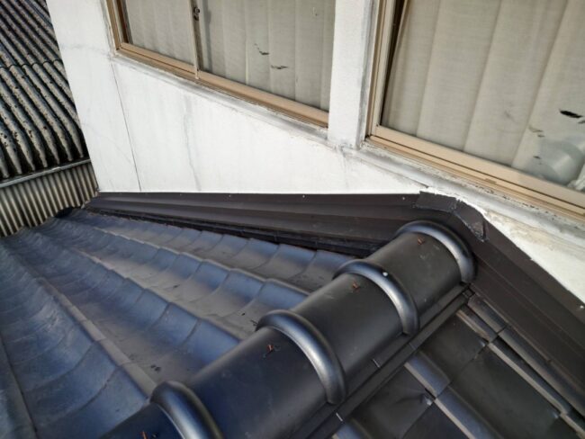 腐食した瓦屋根の壁ぎわの水切りを補修施工。