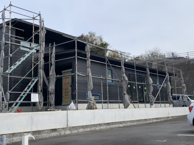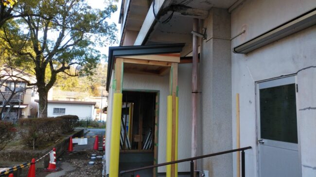 既存の建物の壁面にくっつけて公衆トイレを増築する工事が始まりました。トイレから建物の中への出入り口はなく壁についているだけです。 屋根はタテヒラぶきで施工しました。縦方向の長さが長い所で2.5メートルぐらいで両側に飛び出…