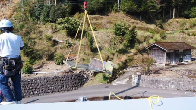 最初見上げたときビックリです、今にも倒れそうでした。しかしレッカーや高所作業車も入れない場所でした。そりドイ高し とりあえずあの外側に大きく反ったタテドイを足場の届く範囲から切断した時にどうやったら安全…