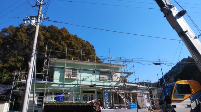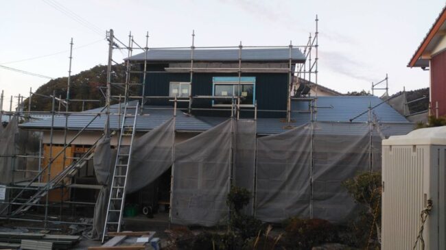 今までは平ぶきのスレート屋根でしたが、経年劣化などで傷んできた屋根をガルバリウム鋼鈑製のヨコブキに屋根替えすることになったようです。 もとの平ぶきスレート屋根材の撤去作業はいつもお世話になっている瓦屋さんに…