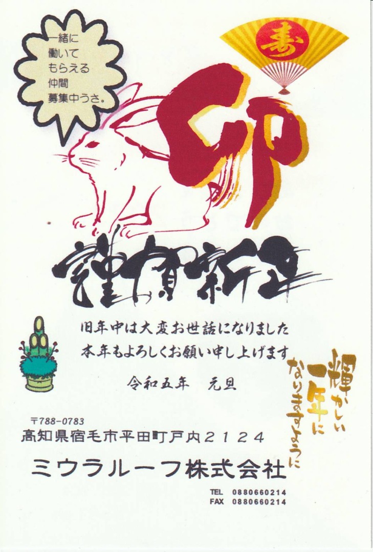 1月12023ミウラルーフの仕事ミウラルーフ株式会社の令和4年の通常営業は12月29日で終了いたしました。 令和5年の通常営業は1月10日火曜日からとなっております。 よろしくお願い申し上げます。 Category: ミウラルーフの仕事By miuraroof2023年1月1日 Author: miuraroof Post navigationPreviousPrevious post:しまんと市でお宮のヨコブキ パート2NextNext post:しまんと市でお宮のヨコブキ パート3Related Posts昨年も皆様方に大変お世話になり、ありがとうございました。2026年1月2日宿毛市で外壁リフォームの水切りを板金2025年12月7日宿毛市でスタイリッシュな作業所が完成です。2025年10月26日宿毛市でベランダ下屋根をリフォーム2025年9月21日四万十市でペールゴールド色のヨコブキ屋根の家が完成間近。2025年8月17日工場でホコラの屋根施工。2025年7月6日