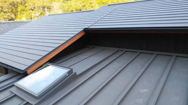あらたにテンマドを取り付けた場所の屋根はろうきゅう化したカワラボウのうえに、ガルバリウム鋼板製のカバー工法の屋根を施行しています。 おもな屋根はヨコブキで施工させていただきました。いぜんは二階建ての屋根だったそうですが、…