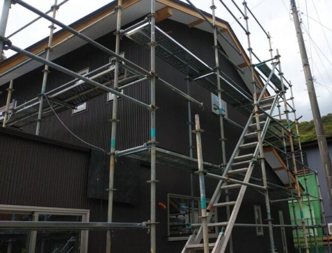 宿毛市の住宅街で屋根はブラックパール色のヨコブキを施工させていただき、前回紹介しましたカベの道路にめんする2面にはブラウン色の四ツ山のスパンを施工させていただきまして。 その裏側にあたる2面にはブラウン色のコナミを施工さ…