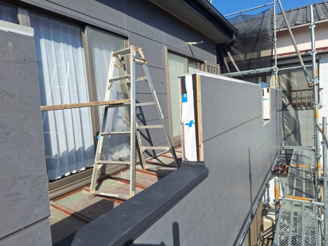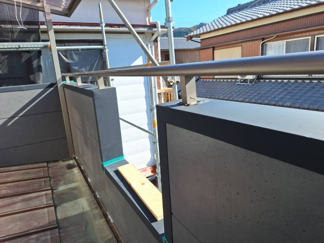 最後にベランダの開口部や手すりが付く上側部分に板金で笠木を施工しました。