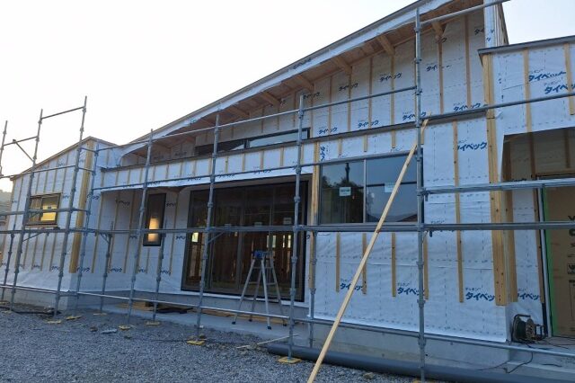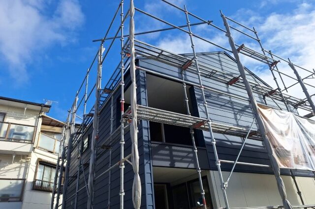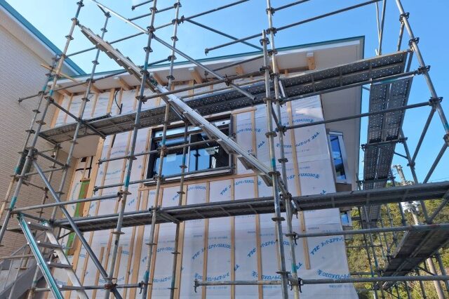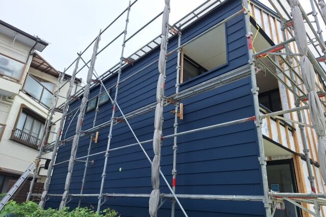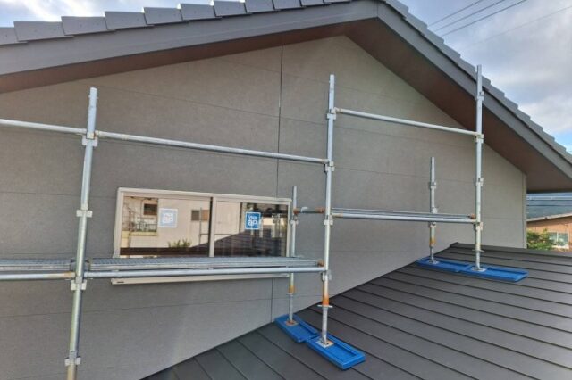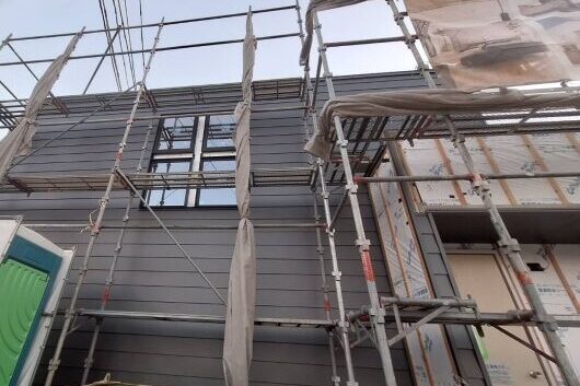 今回は宿毛市でカベ面にヨコブキを施工する作業が始まりました。 最初は玄関入口の方とはま反対の一番長さのある面からスタートしました。 その次になるべく高所の作業から優先して済ましていくために、二階の部分までつながってい…