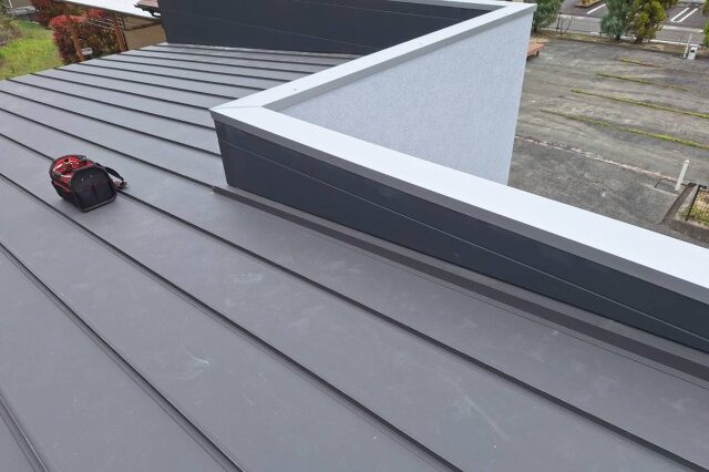 黒潮町で新築平屋建てでとてもスタイリッシュでモダンな家をいつもお世話になっている四万十市の工務店様から依頼を頂き、タテヒラぶきの屋根工事、破風板の板金包み、ガルバリウム製の樋の施工を進行中です。 カベ材も表面はガルバ…