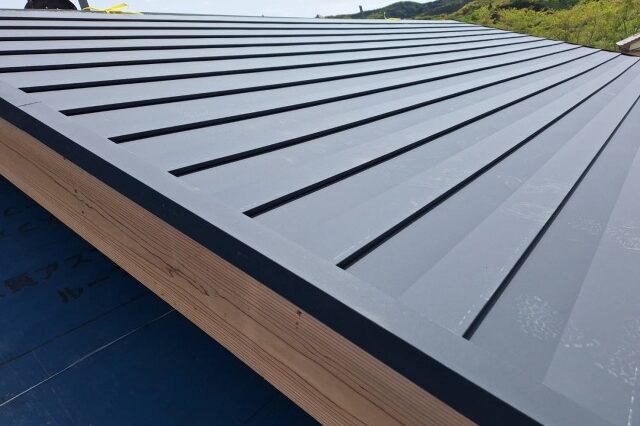 大月町で新築木造2階建て住宅の屋根にエバールーフという板金屋根材を施工させていただきました。 施工方法は一般的なヨコブキ屋根とほとんどが同じですが、横方向に伸びる15ミリていどの引っ掛けてかましていく部分の鼻先の部分…