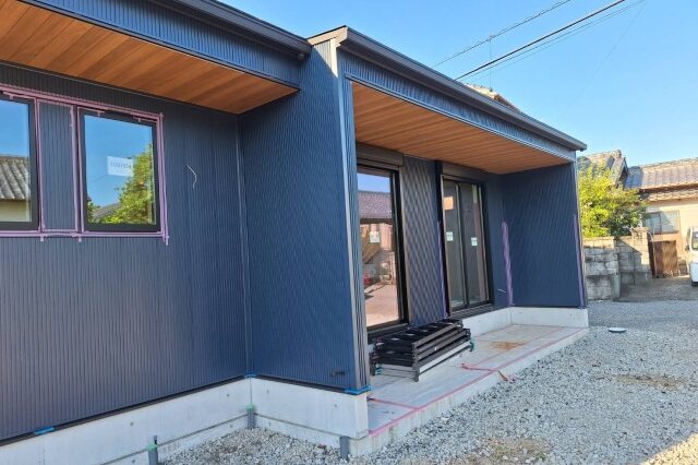 四万十市で通常は屋根材として使用する事が多いヨコブキを、カベ材としてカベ面に施工を進めてきた作業がようやく完了しました。 本体のメインとなるヨコブキは濃いめのあざやかなブルーで、要所々のアクセントに黒い水切りや黒い面…
