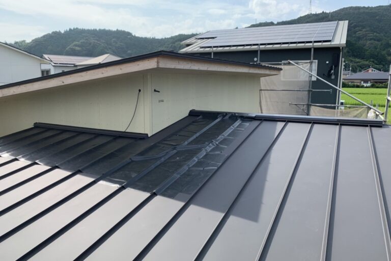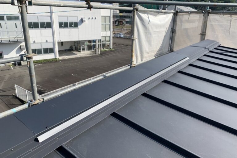 片方にだけ屋根がかたむいている四角形の屋根の一番高いところにきせい品のかんきムネを二つとりつけました。 屋根の種類はカンゴウ式のタテヒラです。カンゴウ式とは?屋根のかたむきにあわせてタテ方向に取り付けていくタテヒラぶき…