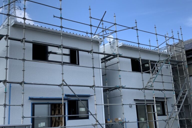 こちらの一戸建てのアパート2棟はカベ材の施工や一番高いところのカサギや屋根の水切り、雨ドイ工事が終わりあと数日で足場の撤去作業がはじまる予定のころの画像です。 四万十市の市街地からそんなに離れておらずかなりの高台にあり災…