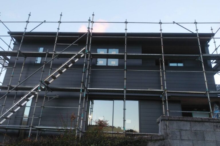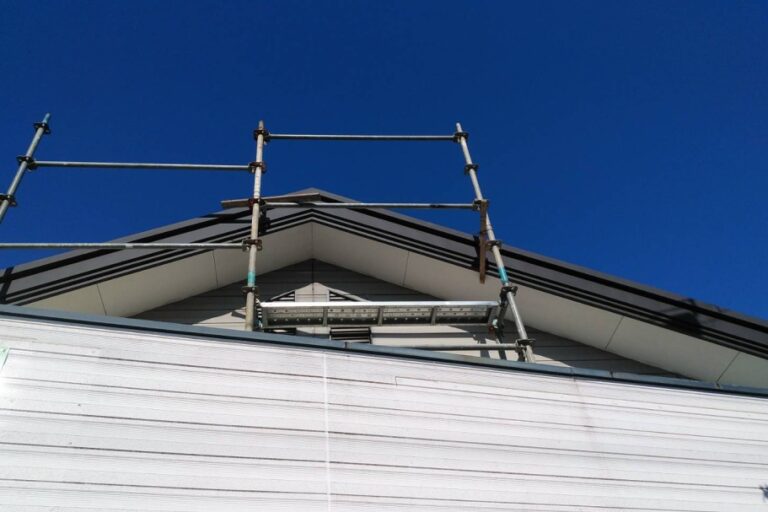 タテヒラぶき屋根や破風板部の工事とヒサシの工事と雨樋は自分たちが施工しましたが、金属サイディングの施工は元請けの工務店さんが施工しました。 雨樋を取り付ける前の破風板は、このような感じです。 足場で見えずらいですが、雨樋…