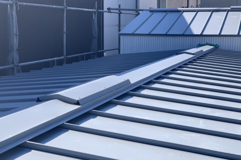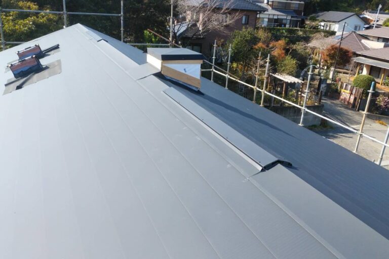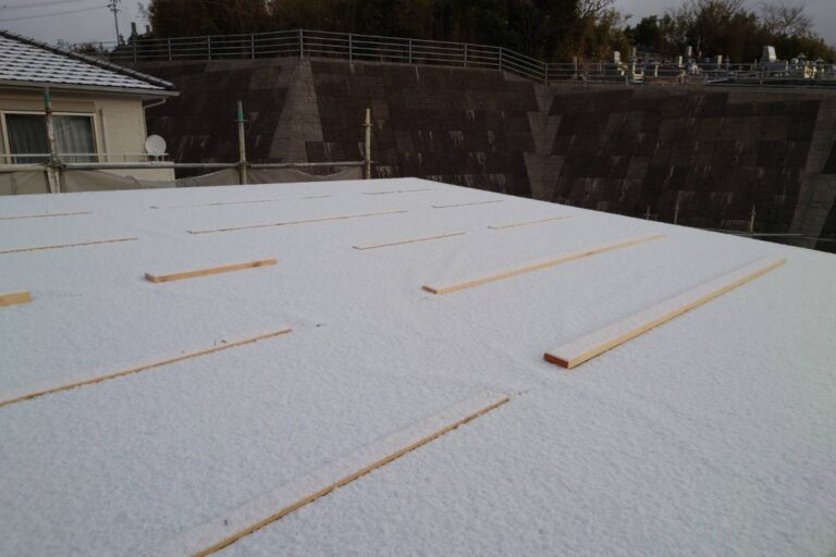 今回は平屋の屋根工事なので材料の荷揚げは人力でした。 比較的簡単な形状の屋根だったので、わりと早いペースで棟の手前までは施工できました。この日はこの状態で作って来る棟の寸法を測り、持ってきていた仮ぶせの棟を取り付けて、雨…